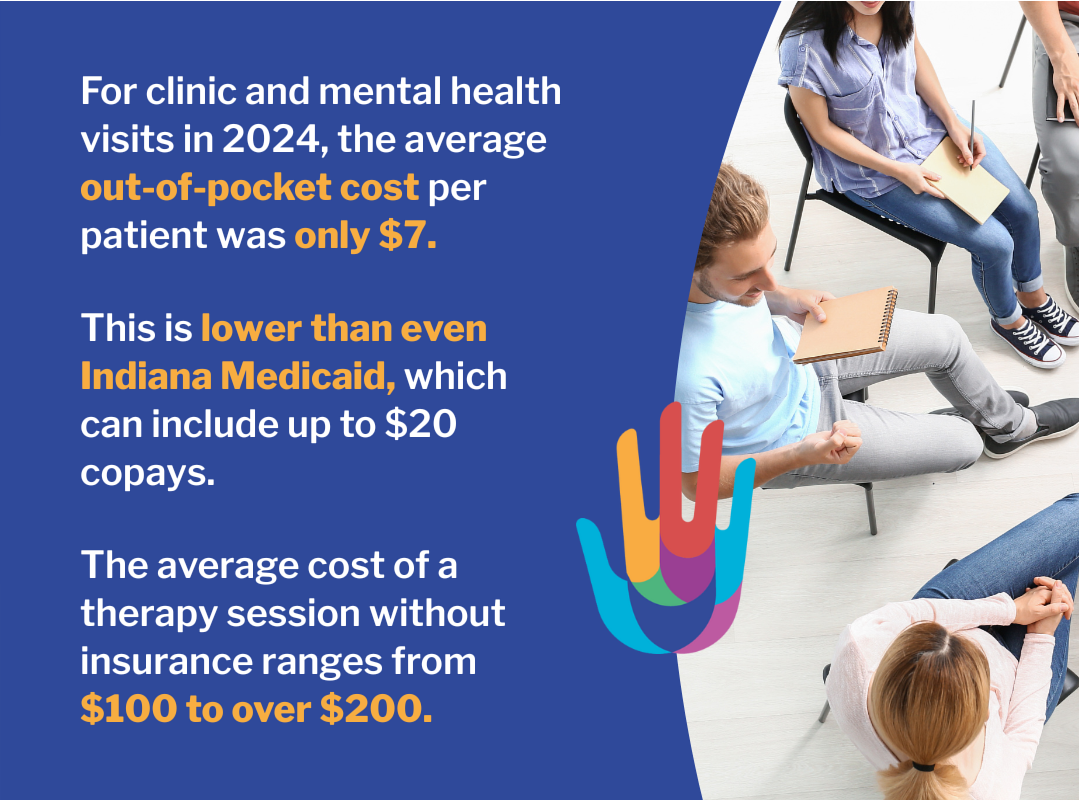 For clinic and mental health visits in 2024, the average out-of-pocket cost per patient was just $7 — lower than Indiana Medicaid's copays of up to $20.